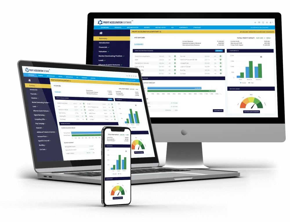 Using key and proprietary algorithms, our Profit Acceleration App allows you to experiment with small, incremental changes in areas of your business. You can create UNLIMITED scenarios and make sound decisions based on real-time and data-driven solutions.